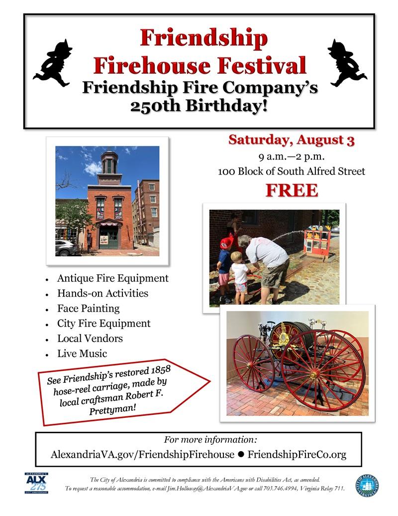 Join us on the 100 block of South Alfred Street. Learn about fire safety today and yesterday and see City firefighting equipment up close. There will be music, displays by community organizations, craft vendors, and food and beverages available. This family event is presented by the Friendship Veterans Fire Engine Association and Historic Alexandria.