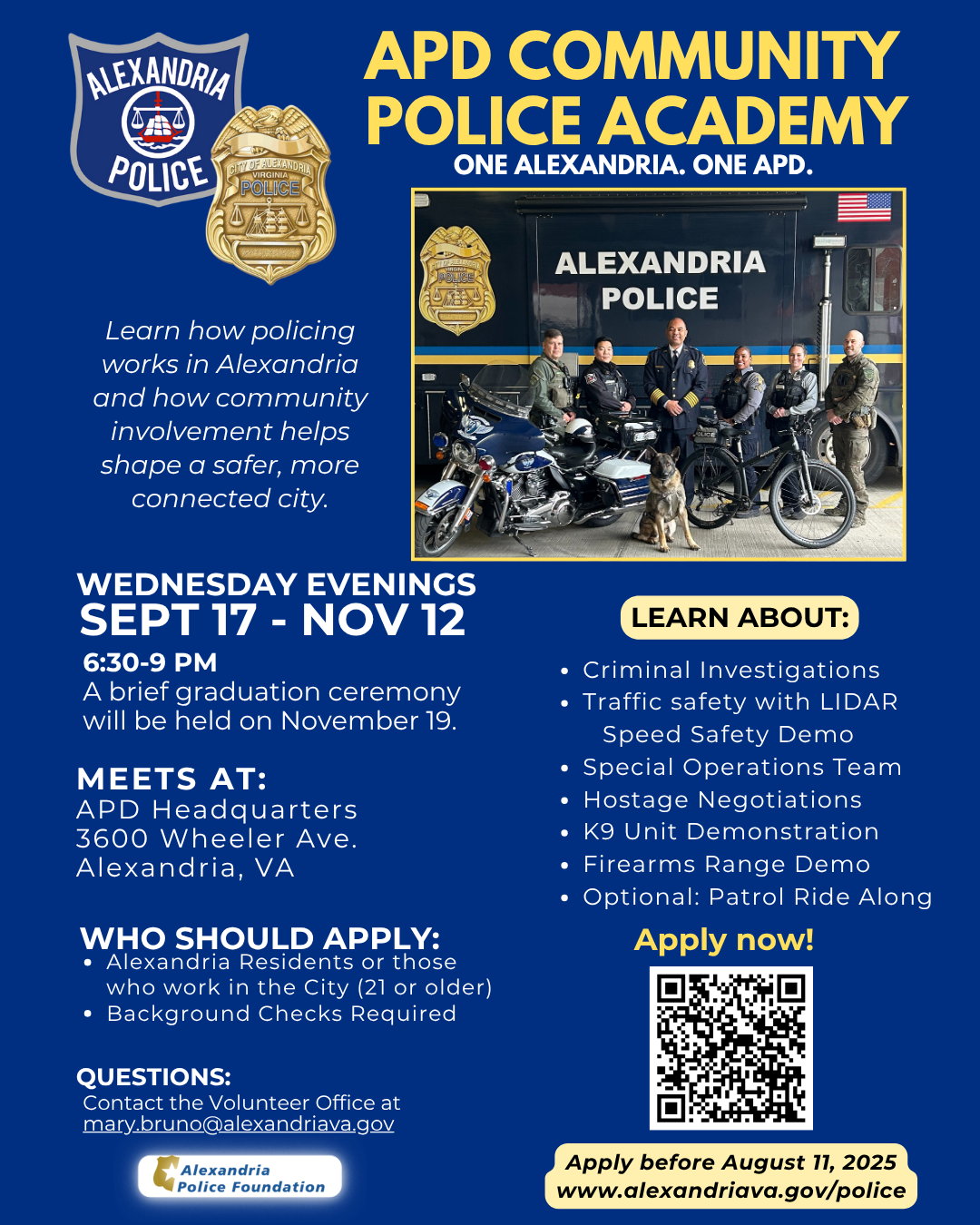 For more information on the Community Police Academy, visit the website or contact mary.bruno@alexandriava.gov.