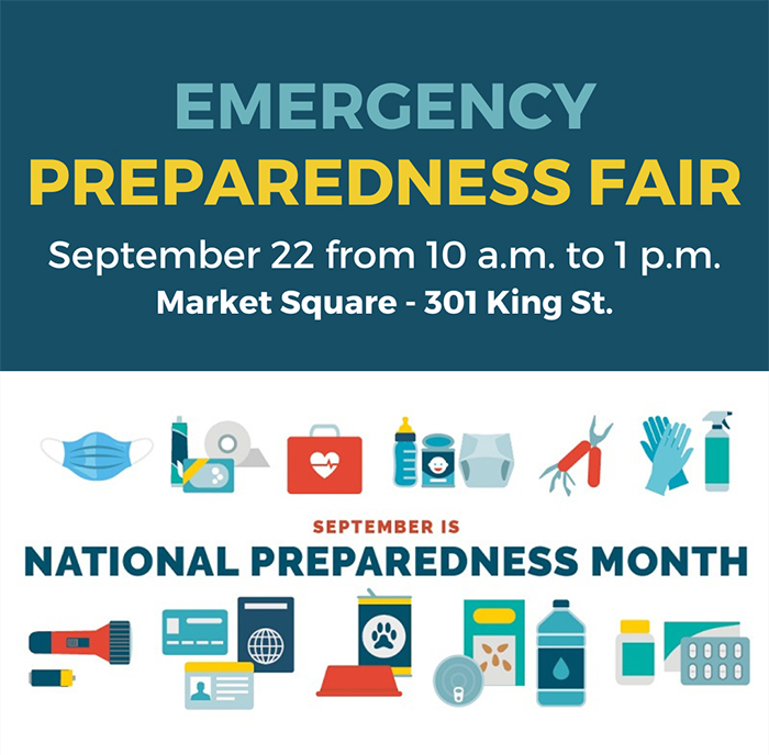 Come to Market Square (301 King St.) on Friday, September 22, from 10 a.m. to 1 p.m. to receive information on preparing for emergencies from City staff and community partners including:
