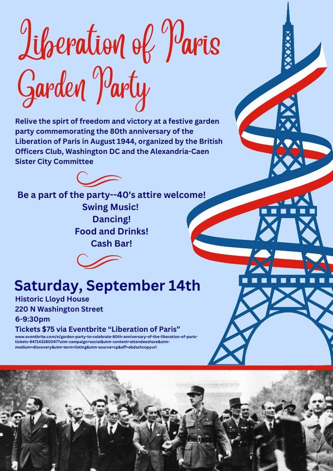 Celebrate the 80th anniversary of the Liberation of Paris at a festive garden party hosted by the British Officers Club, Washington, DC, and the Alexandria-Caen Sister City Committee. Enjoy swing music, dancing, delicious food, and a cash bar. 1940s attire welcome!