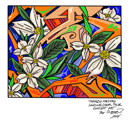Silas’ approved concept includes abstract design elements interwoven with American Dogwood flowers in a vibrant and colorful composition. The mural will be installed in late June.