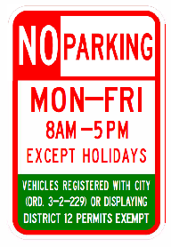 No Parking from 8:00 a.m. to 5:00 p.m. EXCEPT for vehicles that are registered with the City or display a guest or visitor permits for District 12.