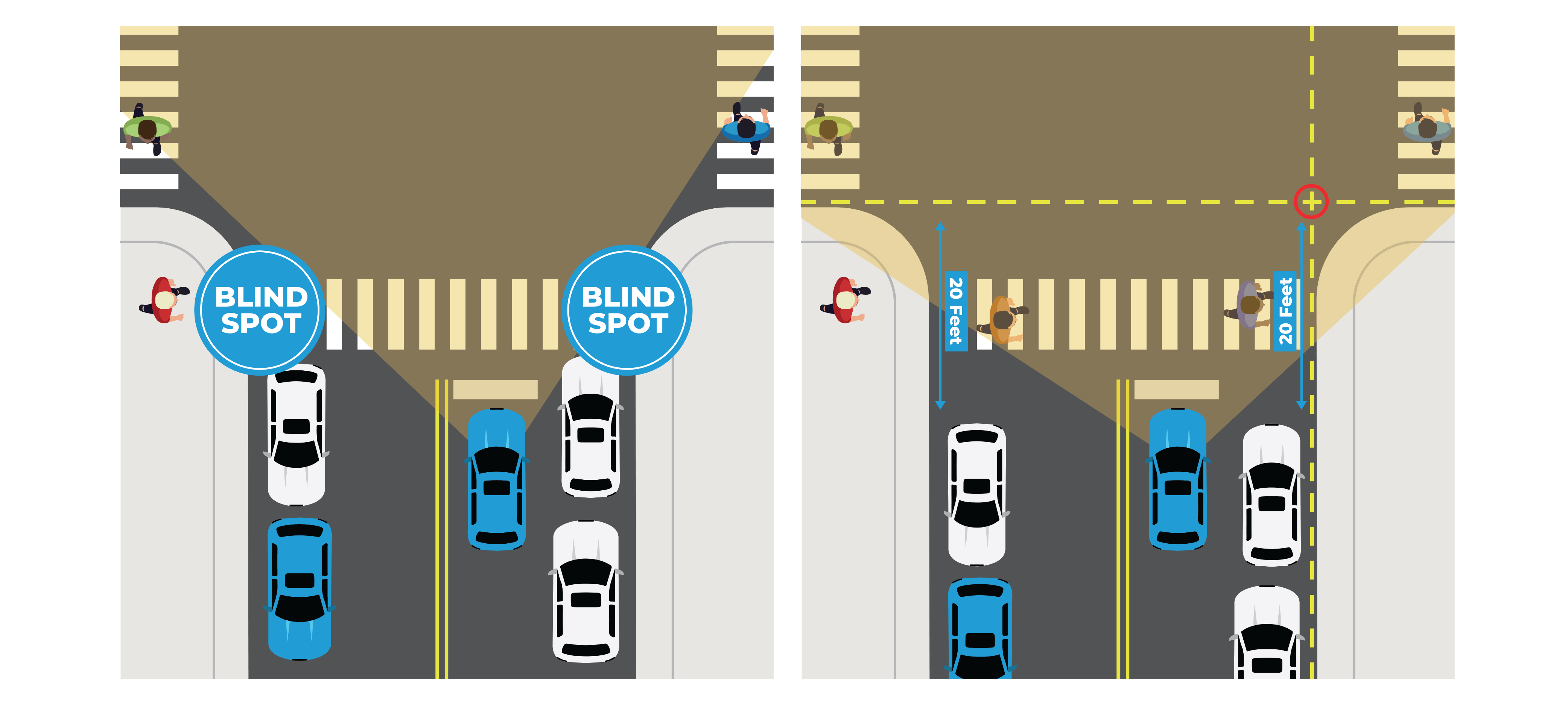 PLEASE NOTE: Section 10-4-41 of the City Code prohibits parking within 20 feet of intersecting curb lines at every intersection citywide. The diagram below demonstrates where this point is at an example intersection (shown with a red circle) and indicates how far from this point drivers should park.