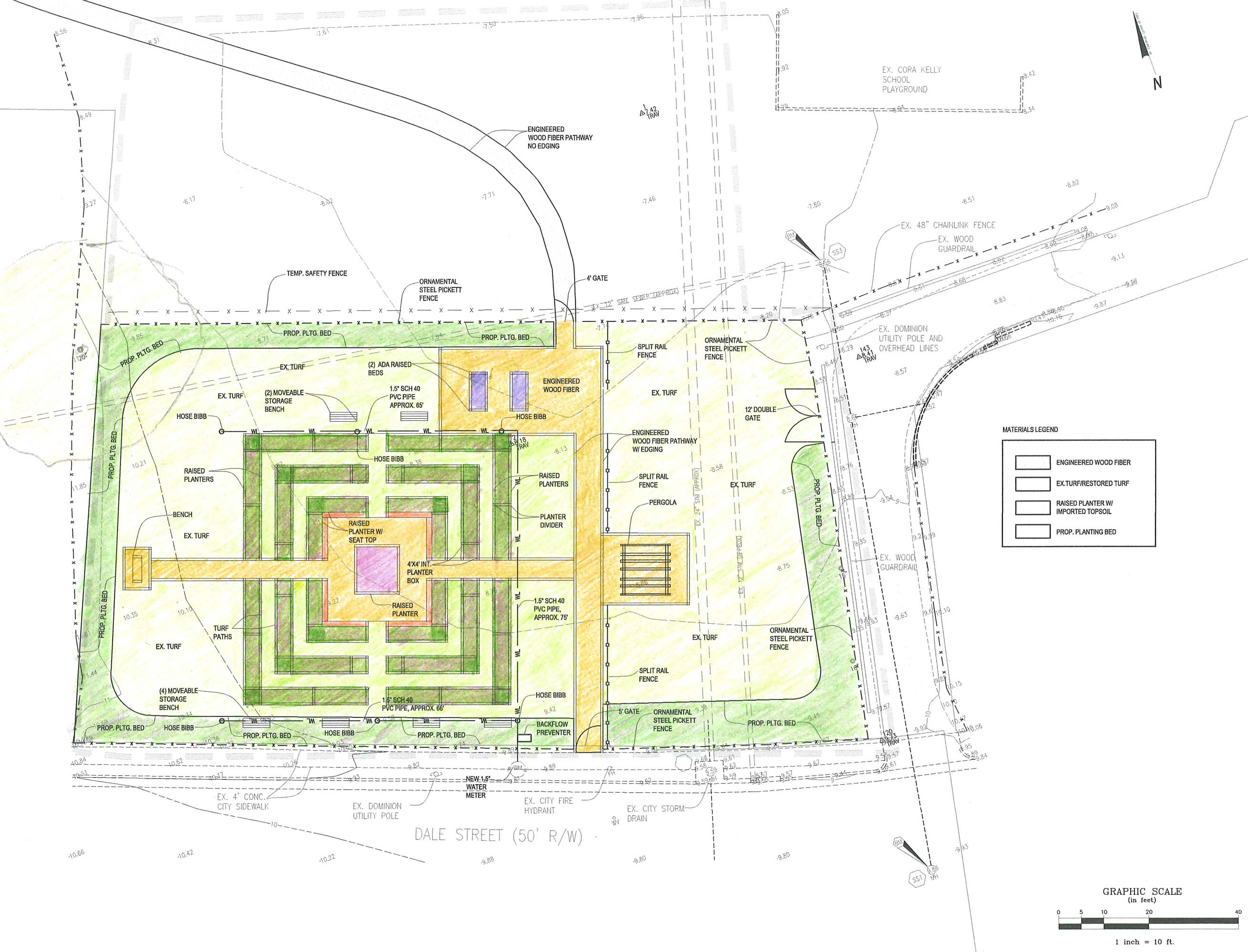 The funds from Rebuilding Together Alexandria will be used towards a design and construction of a garden while the management of the garden site would be through a partnership between the City and local organization. The concept for the site, shown right, is an illustration of what the site could look like, but will be further developed based on community feedback and management capacity.