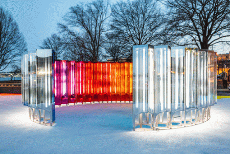 The artwork was programmed to respond to sound with light, allowing visitors to interact with the artwork and affect its appearance using their voices and bodies. The mirrored exterior reflects the urban environment, the river, and visitors themselves but transforms from reflective to transparent when activated. The interior’s surface was tinted with full spectrum color. When illuminated, the interior panels remain mirrored, creating an infinite, colorful reflection that Szivos compares to “a forest of light.”