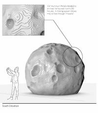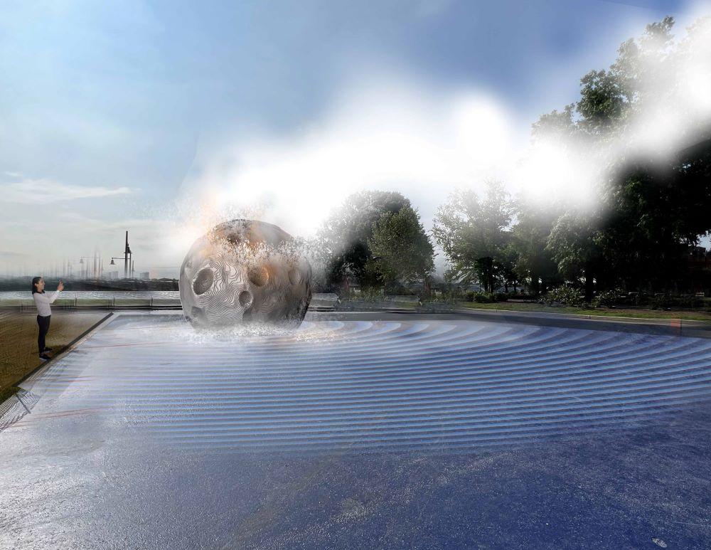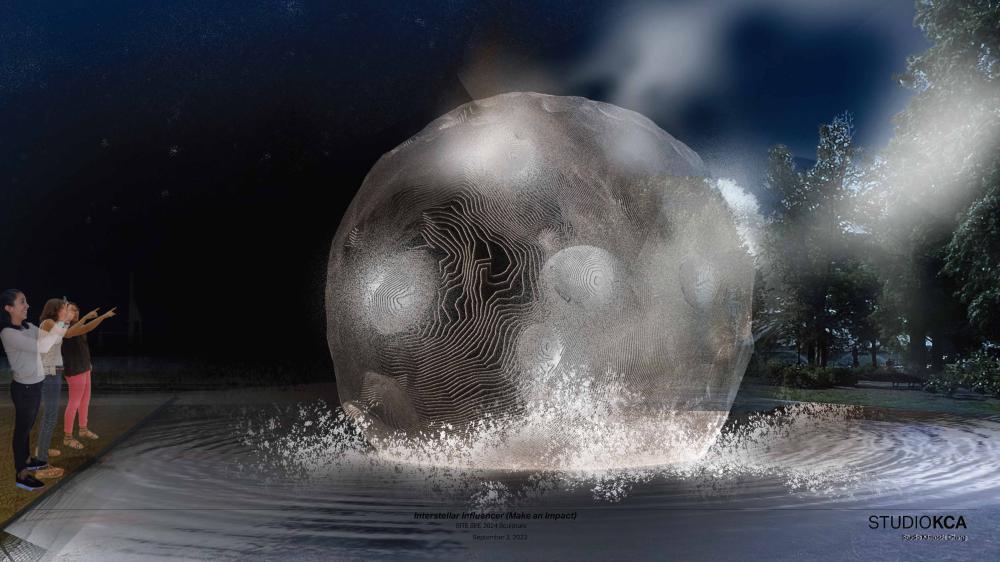 The installation explores the impact of an asteroid that hit the earth 35 million years ago near what is now Alexandria. Interstellar Influencer uses metal, water, and light to create a 1:2000 scale representation of the asteroid and the 85-kilometer-wide, 1.5-kilometer-deep crater it left behind that helped to shape the entire Chesapeake Bay watershed and the flow of water through its rivers and tributaries in the process.