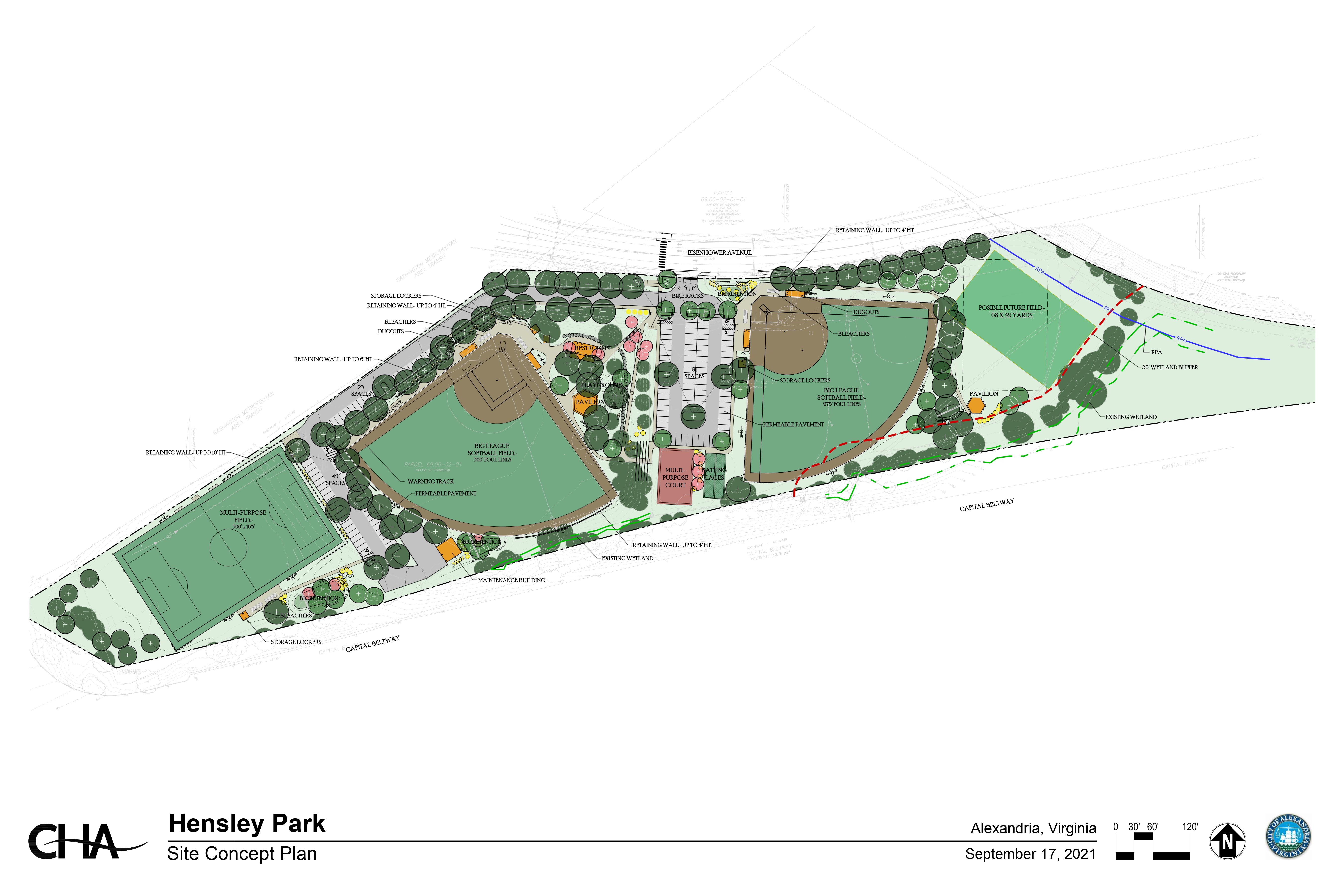 In 2018, Recreation, Parks, and Cultural Activities (RPCA) began designing renovations of Joseph Hensley Park (4200 Eisenhower Ave). Proposed improvements are based on the findings of substantive community outreach, which culminated in the 2014 Joseph Hensley Park Citywide Parks Improvement Plan. Over the design development process, several amendments to the 2014 plan were endorsed by the Park and Recreation Commission and the greater City of Alexandria Community. Joseph Hensley Park Renovation will maintain the diamond and rectangular athletic uses onsite while delivering the following improvements over the course of two independent construction periods: