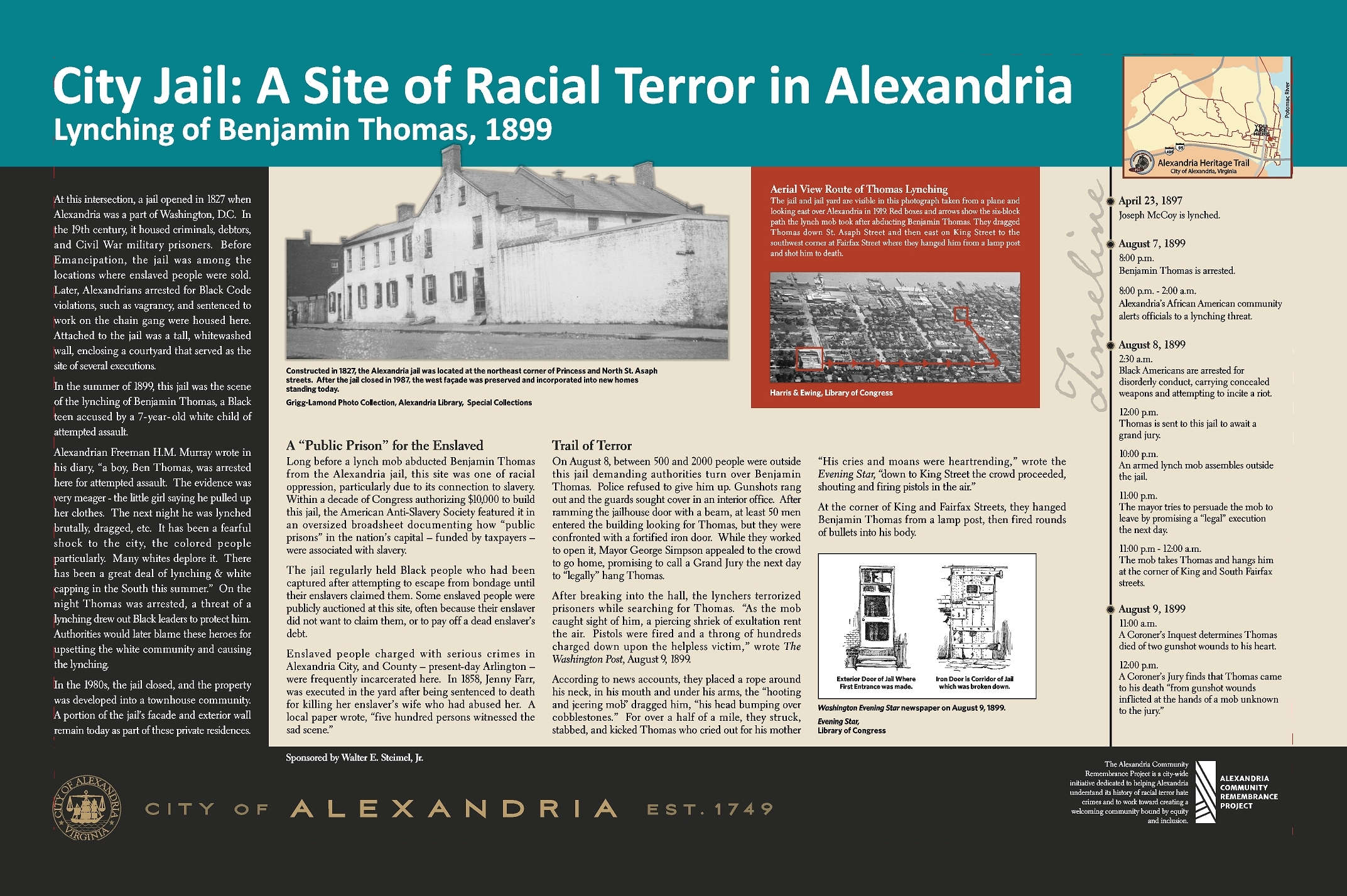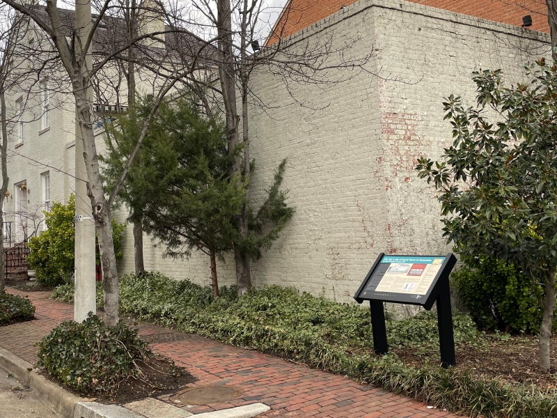 Designed under the direction of architect Charles Bulfinch, the jail (at right) was located at the northeast corner of Princess and North St. Asaph streets and completed in 1827. Those housed in the jail included convicted criminals, debtors and enslaved people, and during the Civil War when the federal authorities controlled Alexandria, military prisoners were also held there. The jail building itself was located along North St. Asaph Street, and a high, whitewashed wall ran south and then east along Princess Street. The brick wall, as tall as 20 feet by 1896, met the building to the north, enclosing the jail yard. The jail yard sometimes served as the site of executions for those sentenced to death. In 1899, a Black teenage prisoner named Benjamin Thomas was abducted from the jail by a mob, dragged several blocks, and lynched at the corner of King and South Fairfax streets. An illustrated marker at the old jail site was installed in 2023 and explores the jail's history as a site of racial terror.