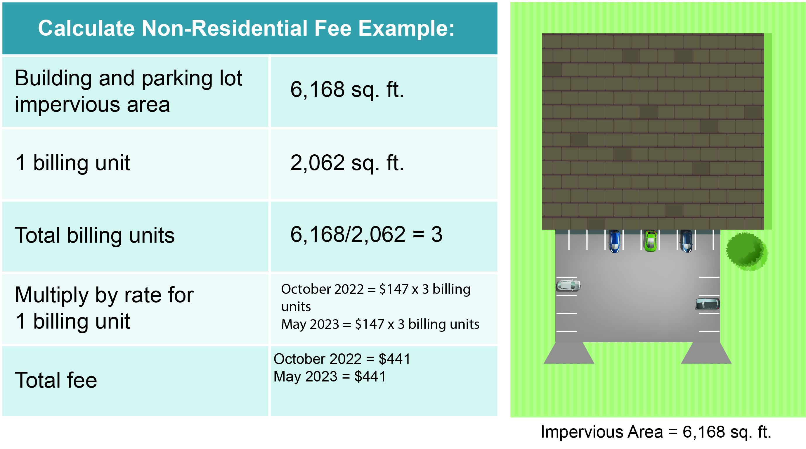 Non-residential properties are billed using a calculated method.  The calculated fee is based on a billing unit of 2,062 square feet.  The total impervious area on a property, such as a building footprint and parking lot, are calculated using GIS analysis.