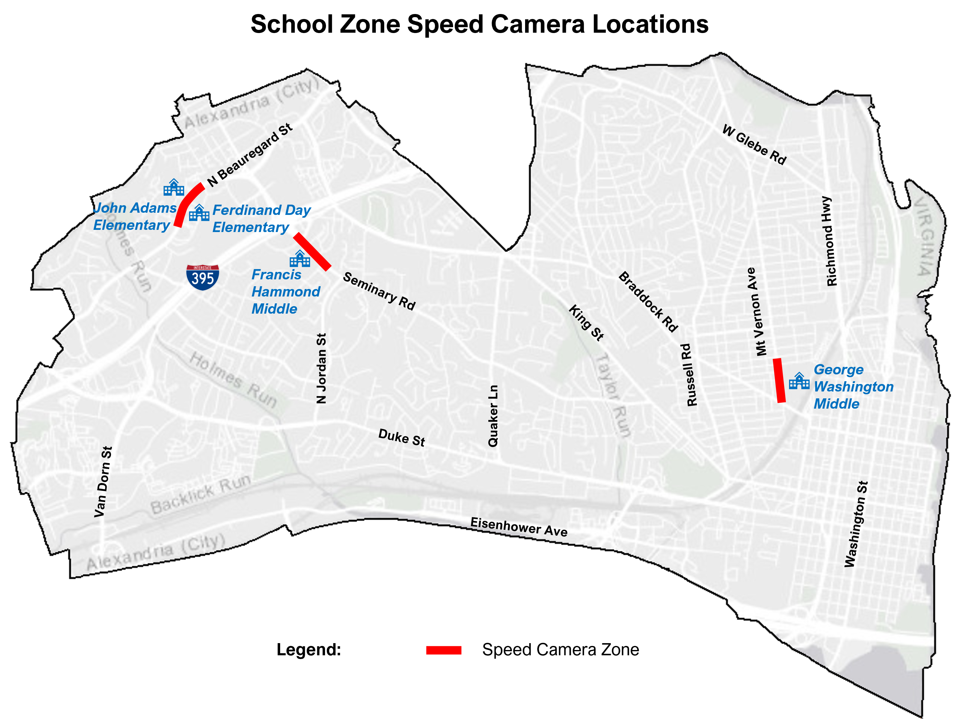 In 2020, the Commonwealth of Virginia passed a law authorizing the use of speed cameras in school zones and work zones. Alexandria joined several communities across Virginia in implementing a speed camera program, including Arlington County, Fairfax County, and the City of Fairfax. Speed cameras are also widely used in Washington, D.C. and Maryland.