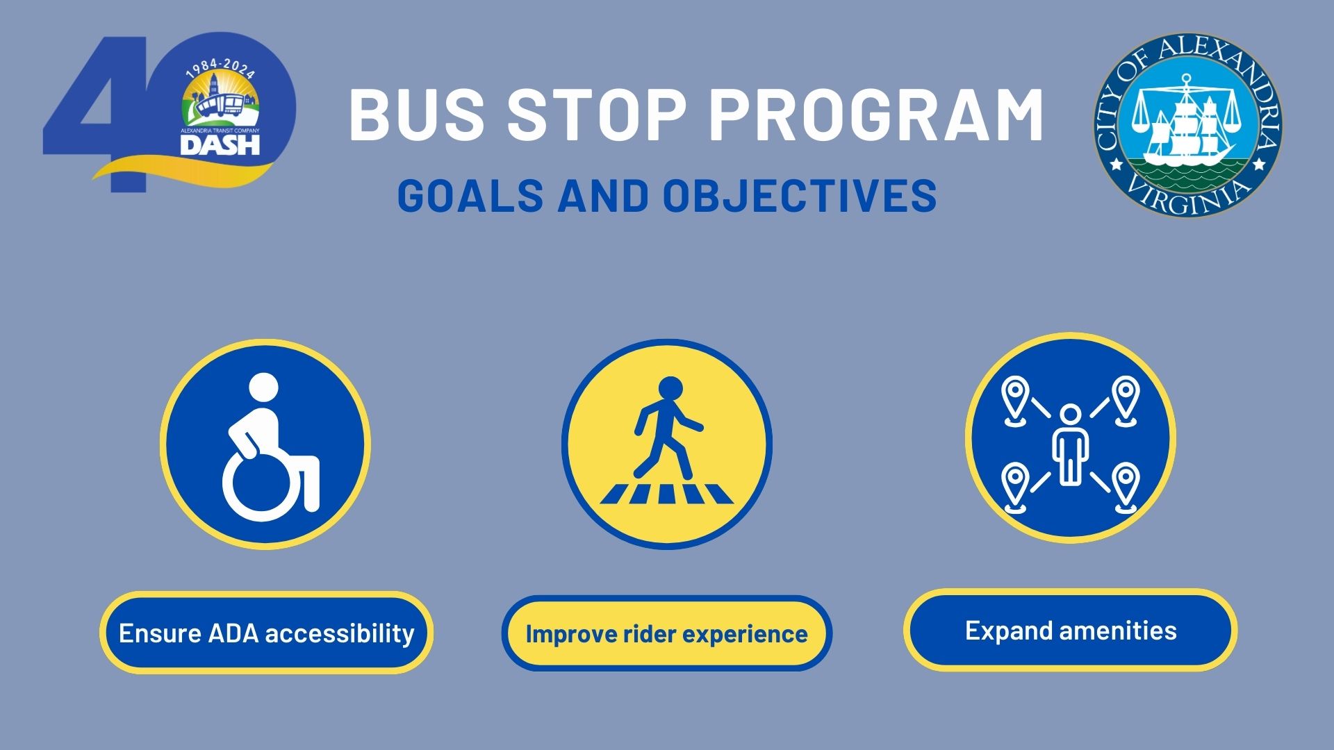 The Bus Stop Program seeks to ensure ADA accessibility, improve the rider experience, and expand amenities. The Alexandra Mobility Plan (AMP) outlines ways to make transit simpler, less expensive, and more convenient. The goals and objectives of the Bus Stop Program are derived from the Transit Chapter of the AMP, specifically Strategy 4 which includes