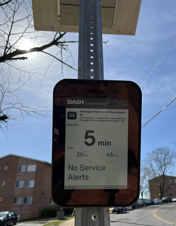 The City has partnered with DASH to install real-time information displays at more than 80 bus stops across the City of Alexandria. The City typically uses Connectpoint Digital Bus Stop displays. These displays provide customers with information on when the next buses will arrive based on real-time bus locations. Most of the displays are solar-powered tablets mounted on bus stop poles, with larger screens or real-time kiosks at major transit hubs or transfer locations.