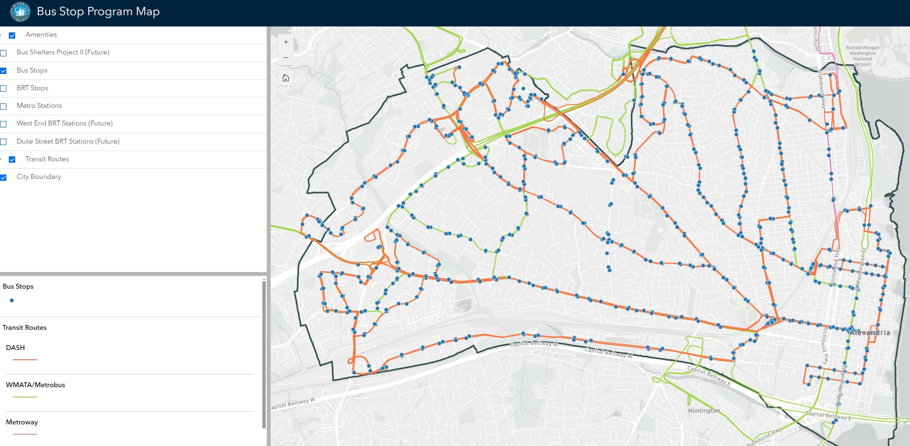 The City of Alexandria has just under 700 bus stops, with service from DASH, Metrobus, and other regional providers. The City is responsible for implementing various improvements to bus stops, such as meeting Americans with Disabilities Act (ADA) requirements, and adding and maintaining bus shelters, seating, bike racks, real-time information displays and other amenities to make transit more accessible, comfortable, and convenient for residents and visitors.