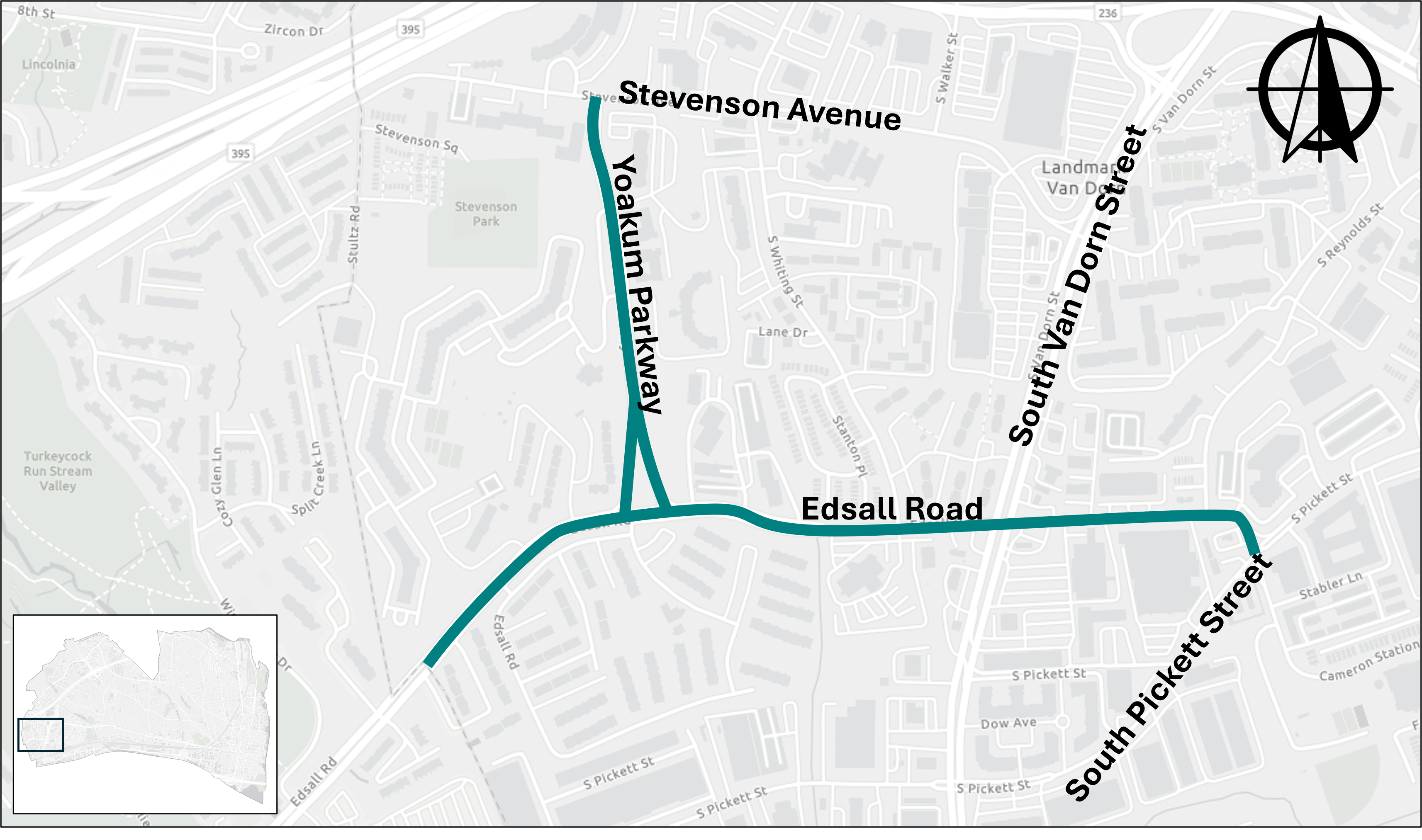 Edsall Road is a four- to five-lane east-west roadway on Alexandria's West End that provides access to various high-density residential neighborhoods, commercial and retail destinations, parks, bus and Metrorail lines, and more. Yoakum Parkway connects Edsall Road to Stevenson Avenue and provides access to multiple high-density residential communities.