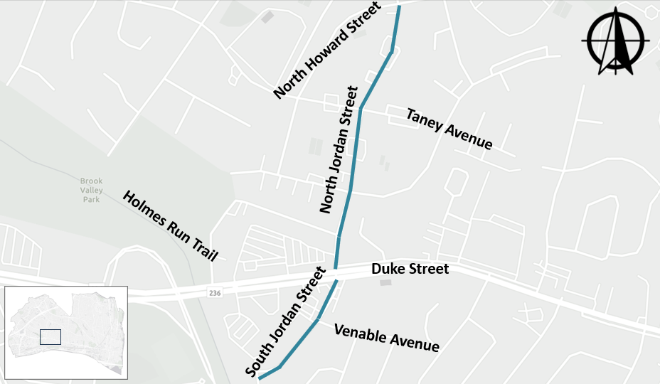 The project corridor spans South and North Jordan Streets, from the Holmes Run Trail to North Howard Street. South Jordan Street is a local street that serves residential uses, commercial uses, and recreational uses near the Holmes Run Trail, Brenman Park and Tarleton Park. North Jordan Street is a major collector that acts as important link between Duke Street and points north, serving the Foxchase Shopping Center, residential uses, WMATA Metrobus services, and provides access to the Patrick Henry School and Recreation Center, and Inova Alexandria Hospital.