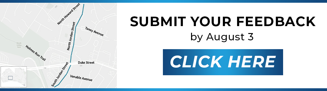 The City's Complete Streets Five-Year Work Plan includes a project to improve traffic safety on South Jordan Street in response to neighborhood concerns. Upon review of crash history and other safety data along North Jordan Street, the City expanded the scope of the traffic safety project to include all of Jordan Street between the Holmes Run Trail to North Howard Street.