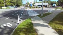 Photograph of installed flex posts at pedestrian median.