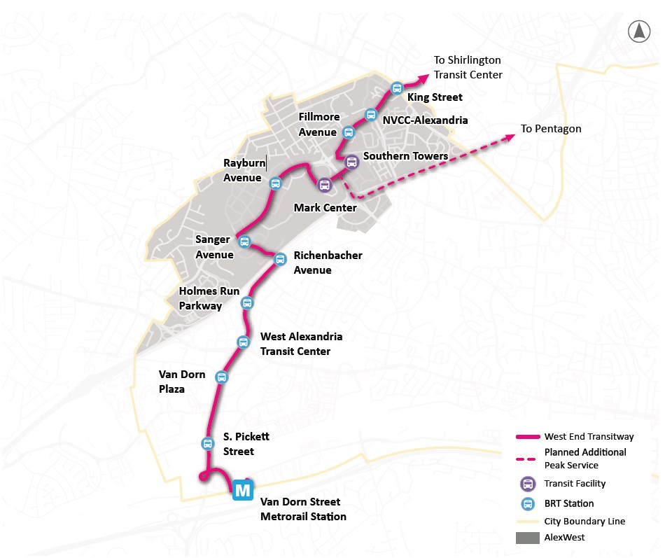 The West End Transitway will connect several major transit facilities, including the Van Dorn Metrorail Station, a new transit hub at the former Landmark Mall site, Mark Center Transit Center, Southern Towers, Shirlington Transit Center, the Pentagon, and several neighborhoods along the corridor.