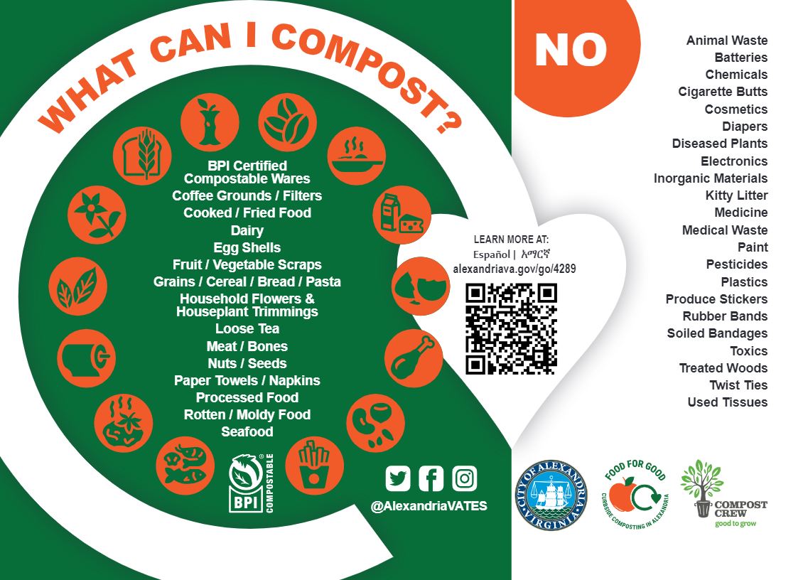 Composting is the natural aerobic (with oxygen) decomposition of organic matter (such as food waste or yard waste) into nutrient rich soil. The City of Alexandria provides a voluntary, fee-based curbside food waste collection program for residents receiving City trash and recycling services at a discounted rate for qualifying households.