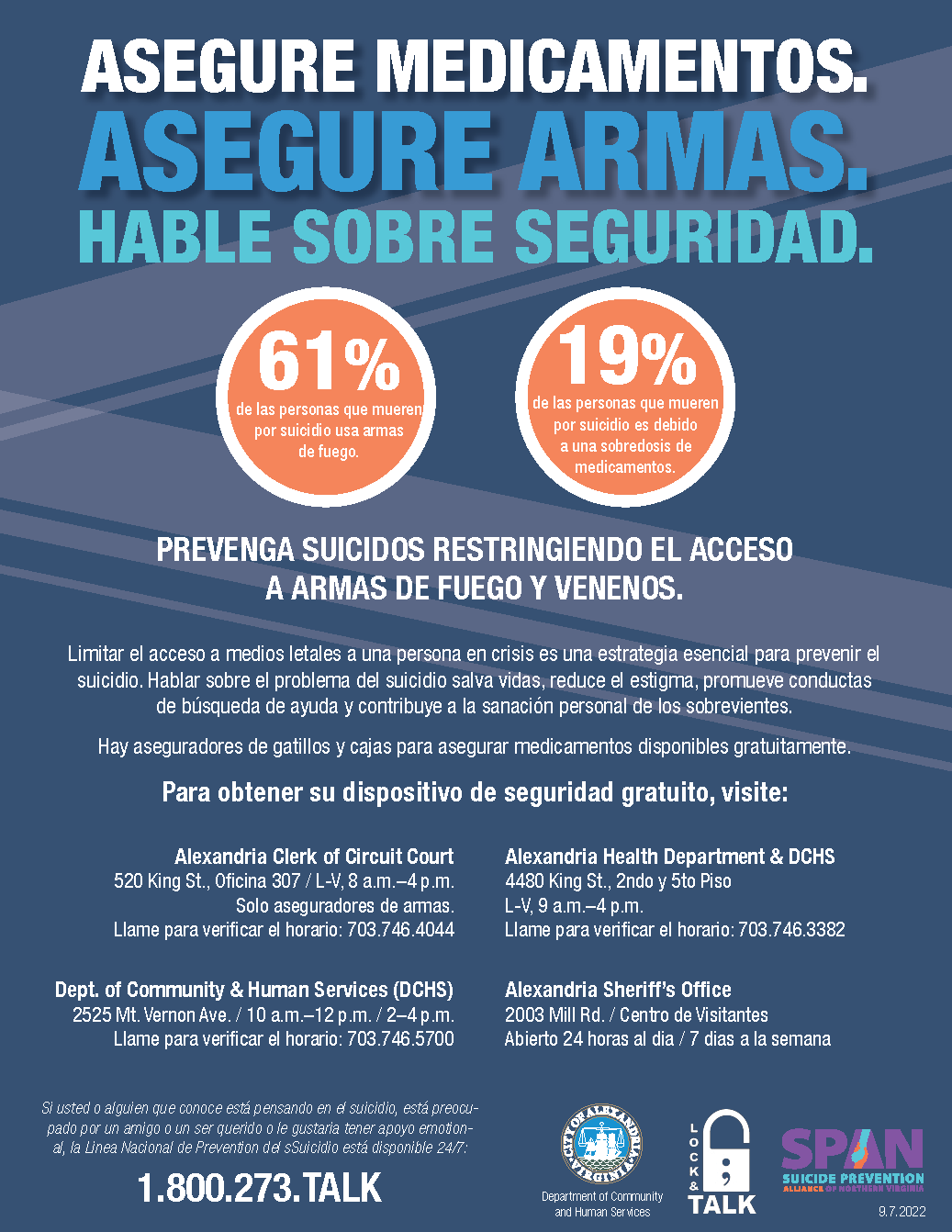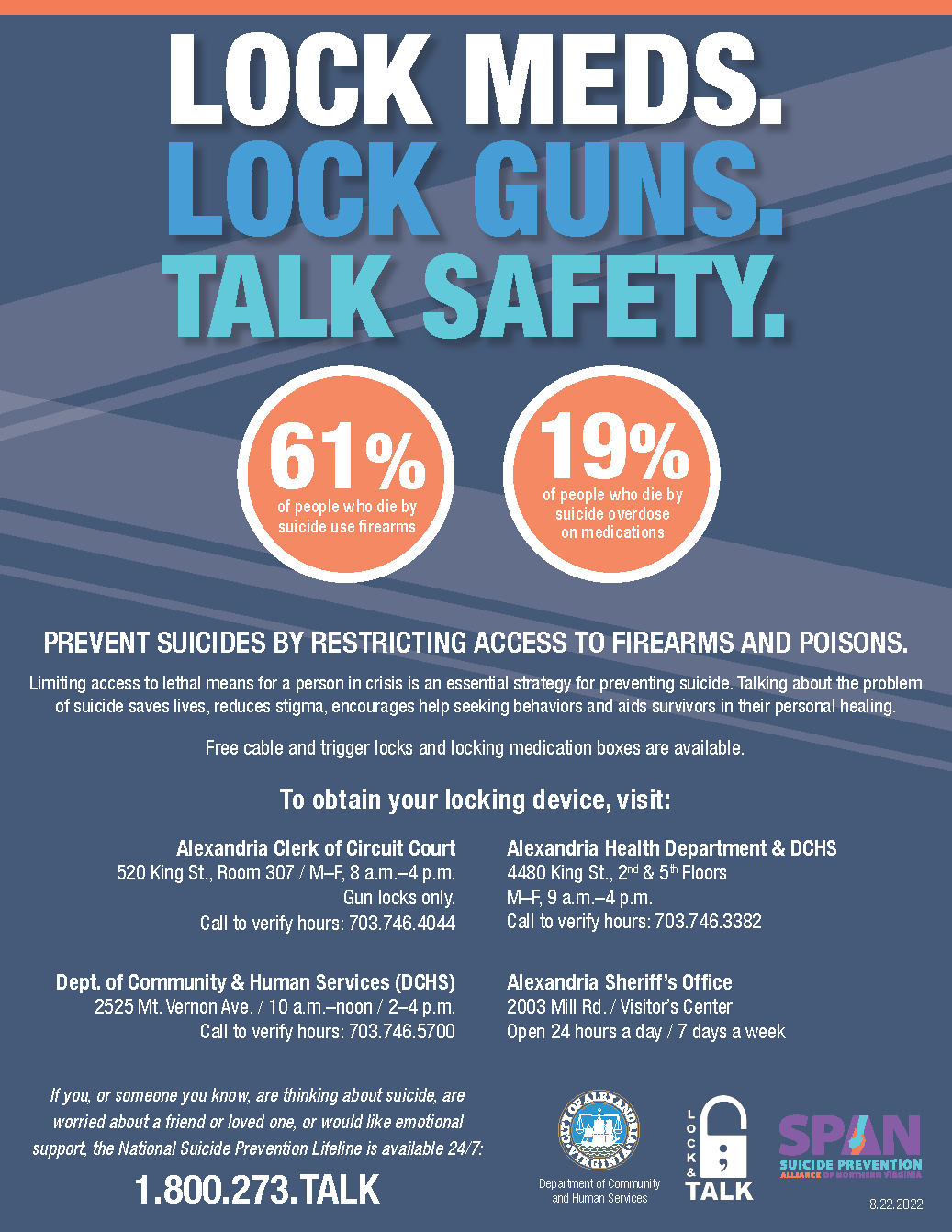 DCHS offers free locking medication boxes and firearm trigger or cable locks as part of Lock and Talk Northern Virginia. Studies show that when firearms are accessible, individuals are three times more likely to die by suicide, and that most people who complete suicide use firearms (61%) or poisons/medications (19%).